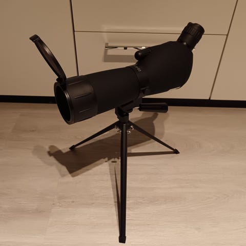 Hyvässä kunnossa oleva KONUS kaukoputki tarvikkeineen 20-60x eyepiecellä ja jalustalla. Jonkin verran kulumaa ja käytönjälkeä havaittavissa. Huom! Tulpat puuttuvat.