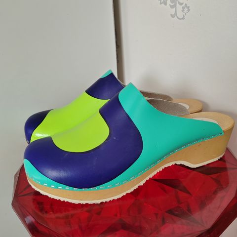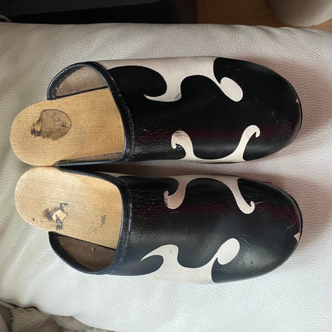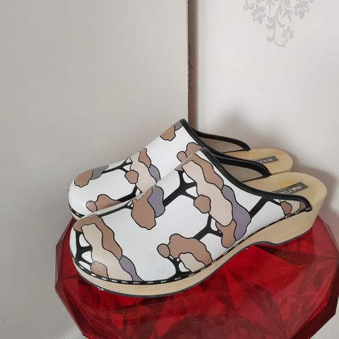 Nahkaa ja puuta. Koko 41. Vähän käytetty mutta puupohja tummunut sisältä, voi varmaan pestä. Voi noutaa tai lähetys 8,90 €
