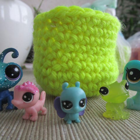 Littles Pet Shop-setti, jossa virkattu kirkkaankeltainen kori/pesä eläimille. Kolme LPS-eläintä ja yksi ylimääräinen panda eksynyt matkaan.