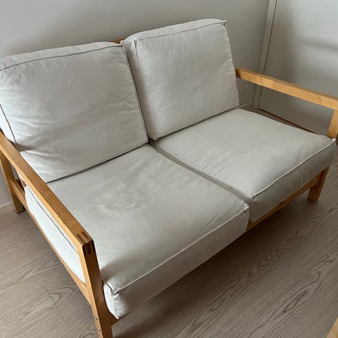 Myydään ikean beige sohva. Yleisilmeeltään siisti, selkätyynyissä pientä nukkaa tullut käytön myötä. Selkätyynyt kiinteät, istuintyynyt irrotettavat. Mustat puiset jalat.