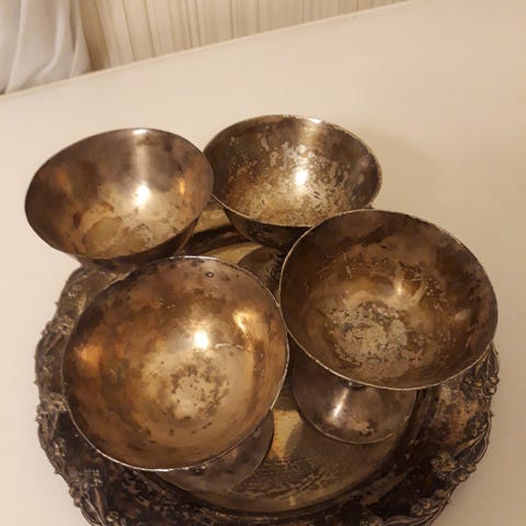 Messinginväriset pikarit hienossa pehmustetussa rasiassa
