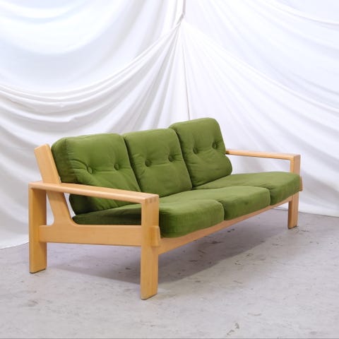 Vihreä samettiverhoilu ja massiivinen puurunko.