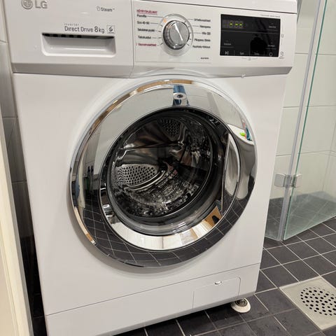 LG edestä täytettävä pesukone valkoisena. Pesukoneessa on etuluukku ja mekaaninen ohjelmavalitsin sekä erilliset painikkeet lisätoiminnoille. Etupaneelissa on useita pesuohjelmia eri tekstiilityypeille, kuten puuvilla, synteettiset ja herkkä pyykki. Näyttöpaneeli ilmaisee pesuohjelman tilan.