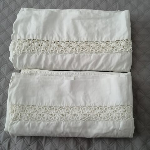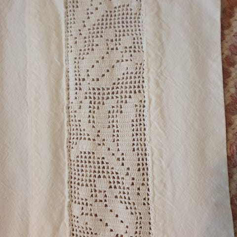 Vanha nostalginen lakana, jossa kaunis virkattu pitsi ja kirjailtu AP. Lakanan koko on 135x205 cm ja materiaali on luonnonvalkoista paksua puuvillaa.