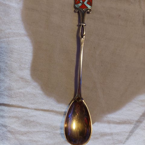Vanha hopealusikka, kaiverrus Elsi ja takana vuosiluku 1912, tahopeapitoisuus leima. Lusikka on tukeva, painava, pituus noin 23 cm.