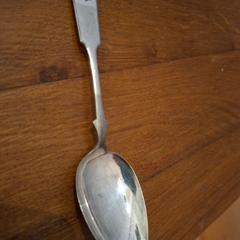 Hopeinen lusikka jossa koristeellinen varsi ja kauhan tyveen jatkuva kohokuviointi. Lusikan paino on noin 23 g (kuvassa näkyvän vaa’an mukaan). Tämä texti tuli automaatilta