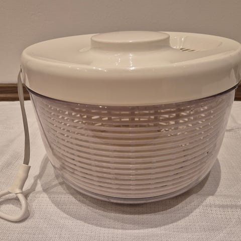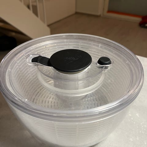OXO salaattikuivain. Läpinäkyvä muovinen kulho, jossa sisäkori salaatin linkoamiseen ja kansi pumppumekanismilla. Soveltuu salaatin ja yrttien huuhteluun ja kuivaamiseen keittiökäytössä.