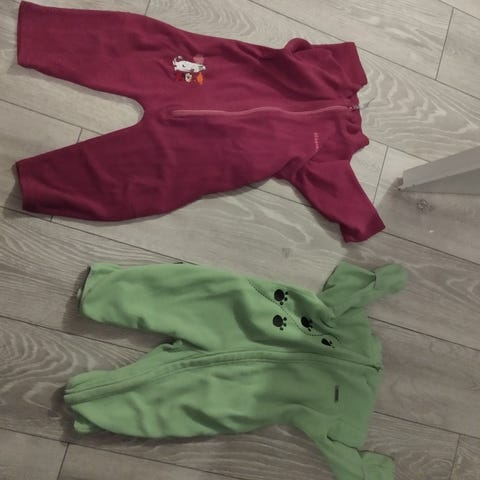 Vetoketjullinen fleece-takki merkkiä Tuffer by Ellos. Housut pehmeää fleeceä (lapussa koko S). Housujen pituus noin 43–44 cm.
