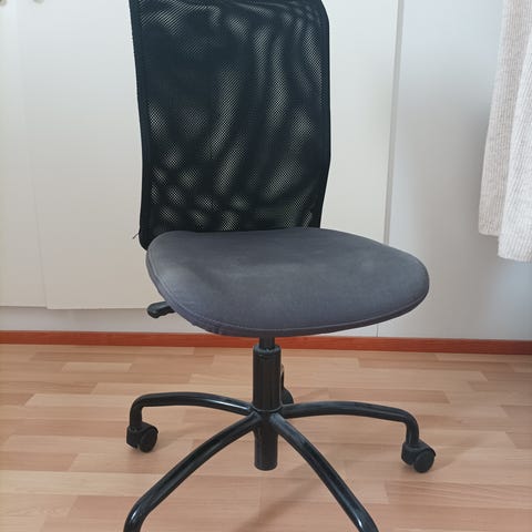 Sininen, hyvässä kunnossa oleva työtuoli. Säädettävä istumakorkeus ja selkänojan asento.