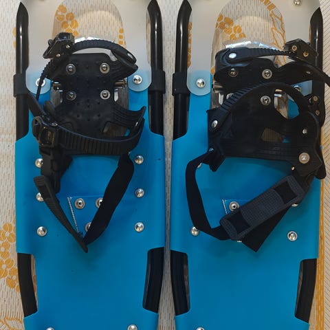 Vaeltaja - merkkiset lumikengät. Käytön jälkiä metalliosissa. Hyvässä kunnossa. Mukaan tulee suojapussi