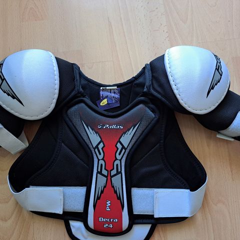 🎨 Väri punavalkoinen. Suojissa on olkapää-, rinta- ja selkäosat sekä säädettävät kiinnitysremmit istuvuuden säätämiseen.