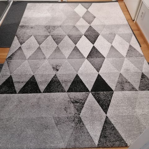 Valkoinen kudottu matto. Pientä nukkaa paikoin toisella puolella. Pesu jää ostajalle.