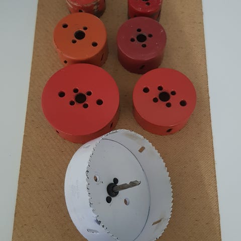 Reikäsaha-setti ATLAS COPCO . 17 osaa. viidellä kiekolla sahattu pari reikää.