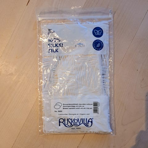 Ruskovilla rinnanlämmittimet villa/silkki on valmistettu suojaamaan herkkiä ja maidontäytteisiä rintoja kylmältä, tuulelta ja vedolta. Ruskovillan 100 % luomumerinovillaisissa rinnanlämmittimissä on silkkivuori.