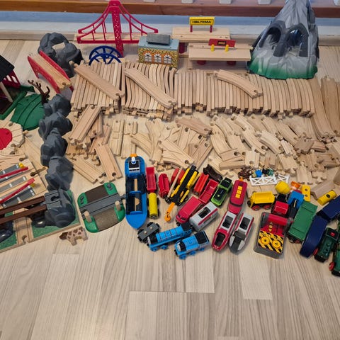 Myydään kovasti tykätty ja leikitty junarata ja kuvassa näkyvät lisäosat vetureineen. Tässä setissä on useamman merkin osia. Yhteensopivia. Puujunarataan kuulumattomat veturit laitan mukaan. Ne ovat olleet mukana junarataleikeissä.