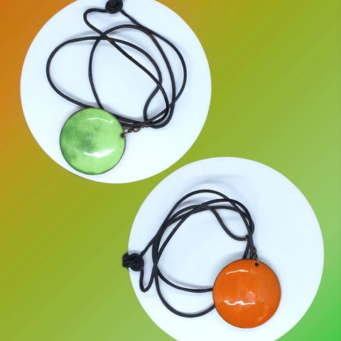 Käsintehty kaulakoru, jossa musta nauha ja pyöreä riipus. Riipuksessa on koristeellinen kuvio ja se on emalia, väri hento lila. Korussa on metallinen lukko ja säätöketju pituuden säätämistä varten. Ketjun pituus 20 cm, korun läpimitta 2.5 cm.