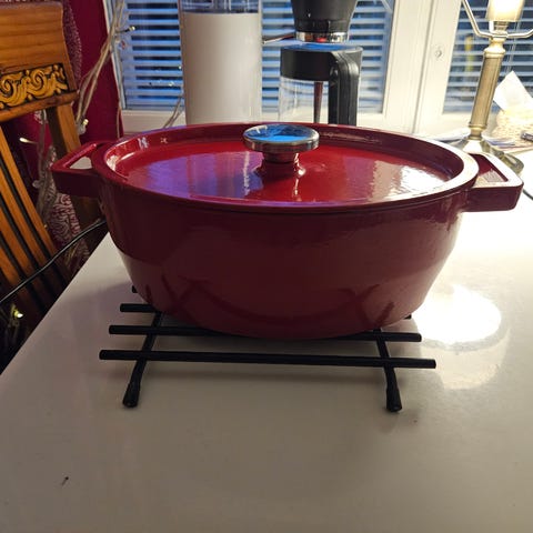 Myydään hyväkuntoinen ja siisti pyrex valurauta pata. Vain yksi hyvin pieni (millimetri) nirhauma kannen kulmassa, näkyy kuvassa