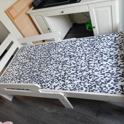 Mukana tulee lasten patja (leveys 73 cm, pituus 115 cm + jatkopala 35 cm).