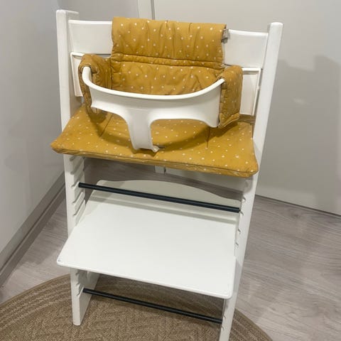 Stokke Tripp Trapp syöttötuoli valkoista puuta. Tuolissa on säädettävä istuin- ja jalkataso, jotka voidaan asettaa eri korkeuksille ja syvyyksille lapsen kasvun mukaan. Rakenne on tukeva ja suunniteltu siten, että tuoli voidaan säätää sopivaksi eri-ikäisille käyttäjille. Soveltuu käytettäväksi ruokapöydän ääressä lapsen omana istuimena.