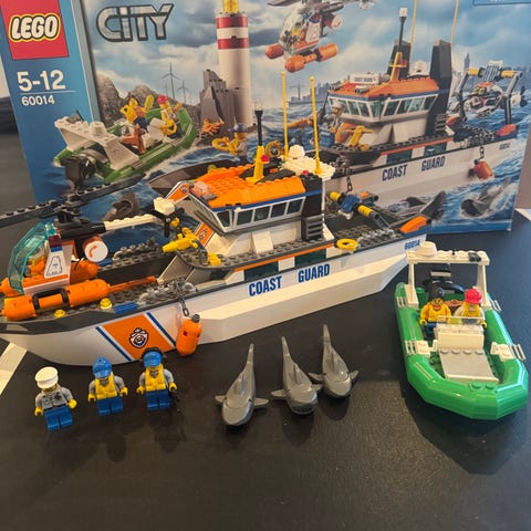 LEGO City rannikkovartioston helikopteri -rakennussarja. Settiin kuuluu rannikkovartioston helikopteri, pelastusvene purjeella, kaikki hahmot varusteineen sekä hai. Palikat hyvässä kunnossa ja kaikki tallella