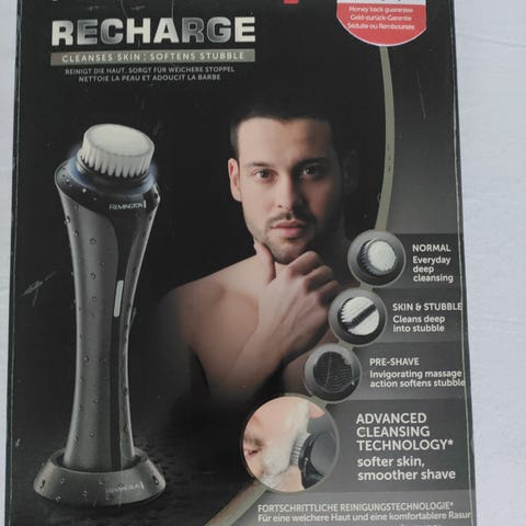 Remington kasvoharja ihonpuhdistukseen. Mukana useita vaihdettavia harjapäitä, joista kuvissa näkyvät normaalille iholle, herkälle iholle ja hierontaan tarkoitetut päät. Paketissa on lisäksi lataustelakka, verkkolaite ja säilytyspussi. Laite soveltuu kasvojen puhdistukseen ja hierontaan erilaisille ihotyypeille valitun harjapään mukaan.