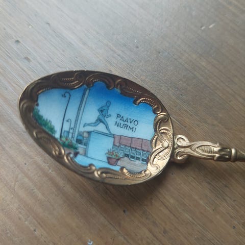 Helsinki ja Paavo Nurmi -aiheinen matkamuistolusikka. Kuvissa ei vikoja, metalliosassa vähän ajan patinaa.