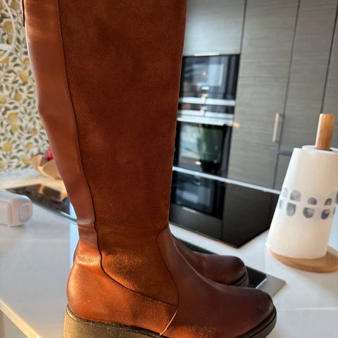Kuin uudet saapikkaat koko 42. Takana joustoresori. Ollut jalassa kerran n 5 min. verran kyläilyreissulla. Oma koko 40/41 niin vähän isot. Siksi jäänyt käyttämättä. Ohut pehmeä vuori. Pohkeen kohdalta mahtuu 45 cm ympärysmitalle venytettynä (ei veny paljon. Ehkä n 3 cm) Maksoivat 187e.