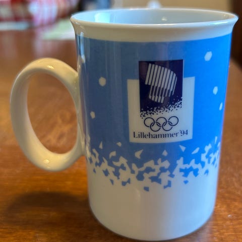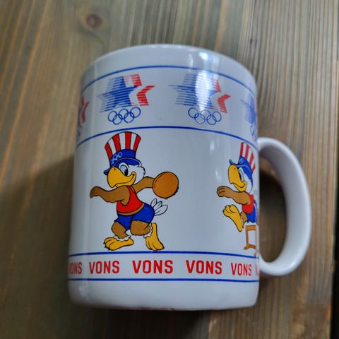 Kahvaton muki, jota koristavat Suomen lippu, olympiarenkaat ja Finland-teksti. Siisti ja ehjä.