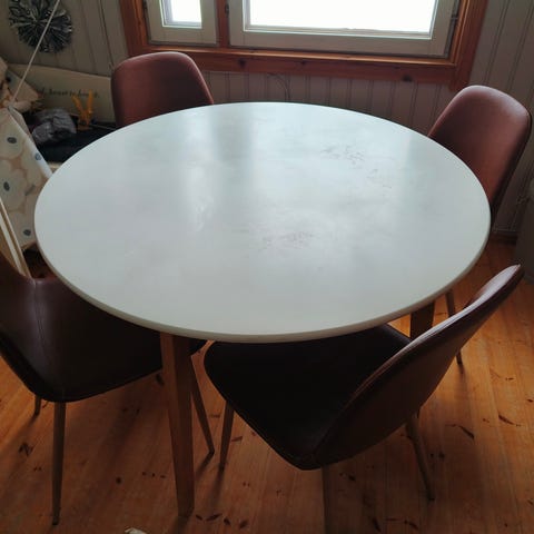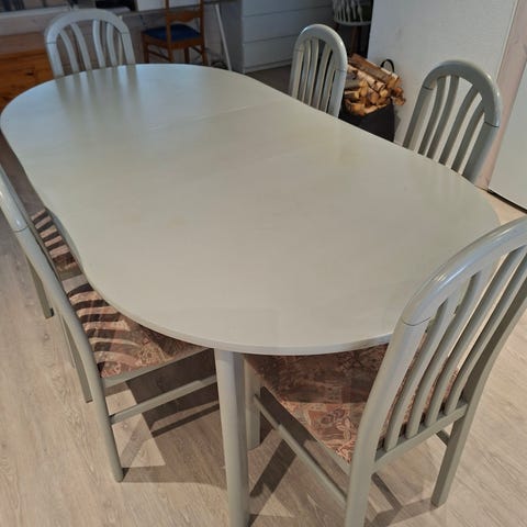 Puinen ruokapöytä ja neljä söpöä tuolia, muuton tieltä pois. Alkaa olla jo parhaat päivänsä nähnyt pöytä, pinnassa kulumaa ja vähän huterat jalat. Omassa käytössä kuitenkin ajanut asiansa ruokapöytänä. Tuolien istuinosat irrotettavat, yhdessä pieni tahra.