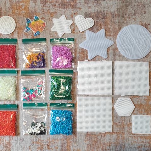 Mini hamahelmiä 6 pussia, 3 avaamatonta ja 3 lähes täyttä. 2 alustaa.