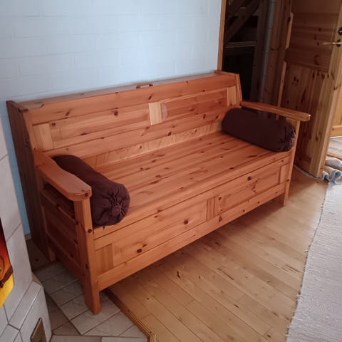 Tukeva puusohva vuodelaatikolla. Vuodelaatikon koko on 159 x 66 cm. Mukana tulee n. 10 cm paksuinen patja 133 x 185 cm. Väri on vanha valkoinen. Tosi hyvä varavuoteena.