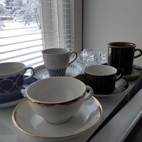 Arabian Kosmos kaakaokuppi, ikäisekseen hyväkuntoiset astiat, jotain ajan tuomaa kulumaa on