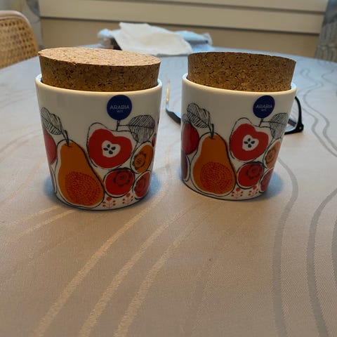 Arabia purkki sininen lumihiutalekuvio puukannella