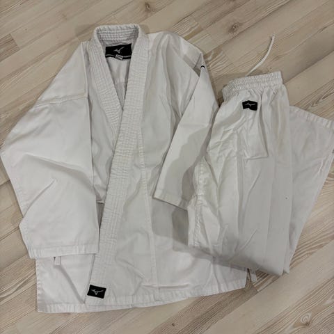 Kamppailulajien puku lapselle tai nuorelle, koko 160 (reilu koko). Valkoinen kaksiosainen asu, jossa yläosa (takki) ja alaosa (housut). Sopii esimerkiksi eri kamppailulajeihin harjoittelukäyttöön. Materiaali vahvaa kudottua kangasta, joka on tyypillinen kamppailulajipuvuille.