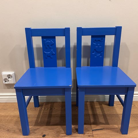 Pienikokoisen tuolit lapsille, jossa puinen istuinosa ja maalatut puurunko-osat. Sopii esimerkiksi lastenhuoneeseen, leikkipöydän ääreen tai askarteluun. Istuinosan korkeus 33 cm,selkänojan korkeus 64 cm.