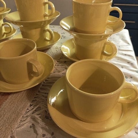 Keltaiset hyväkuntoiset, vaikkakin käytetyt, Arabian Teema kahvikupit, tassit ja kakkulautaset. Värin valmistus lopetettu. Kakkulautanen sama kuin isomman kupin tassi