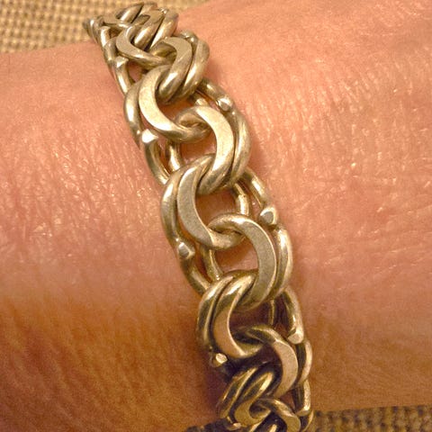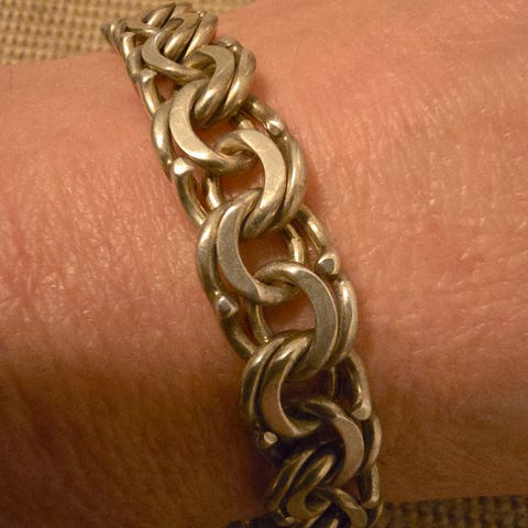 Materiaalina on hopea, kuvissa näkyy 925-leima. Ketju on litteä ja leveä, ja siinä on jousirengaslukko. Sopii käytettäväksi arjessa tai juhlavampien asukokonaisuuksien kanssa sekä yksin että muiden rannekorujen kanssa kerrostettuna.
