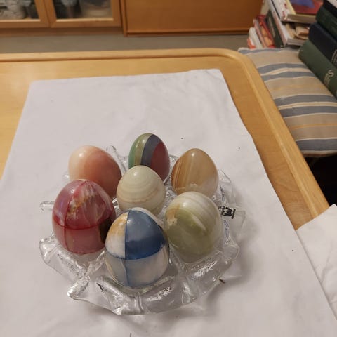 10 munaa, kaikki kiveä. Eri kokoisia, liilat ainakin kananmunan kokoisia.