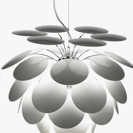 Marsetin Discocó 53 -riippuvalaisin vangitsee huomion valon, varjon ja muotojen leikillä. Christophe Mathieun vuonna 2009 suunnittelema Discocó rakentuu kromatun rungon varaan asetetuista pyöreistä levyistä, joiden molemmat puolet heijastelevat valoa ja tekevät valaisimesta häikäisemättömän.