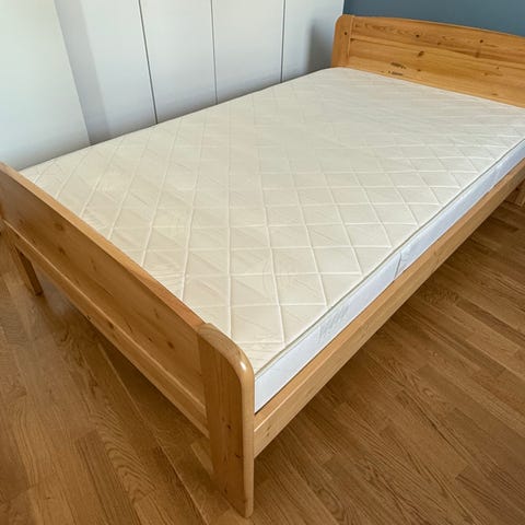 Myydään vanhahko tukeva sängynrunko 120cm. Patja ei tule mukana. Joistain kohdin maalista pieniä kohtia lähtenyt.
