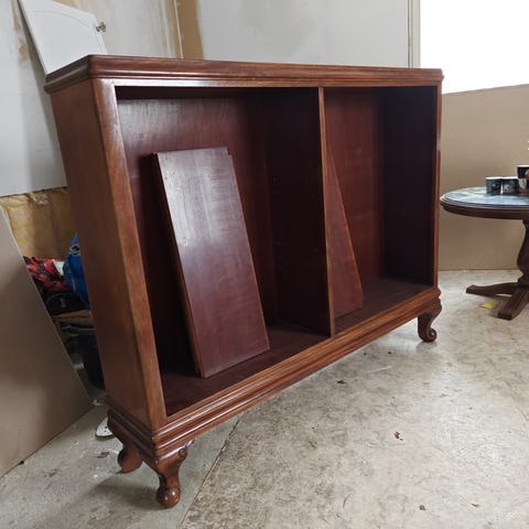 Vanha täyspuinen hylly. Ollut joskus aikanaan kaappi, mutta ovet on irrotettu. Maalattu.