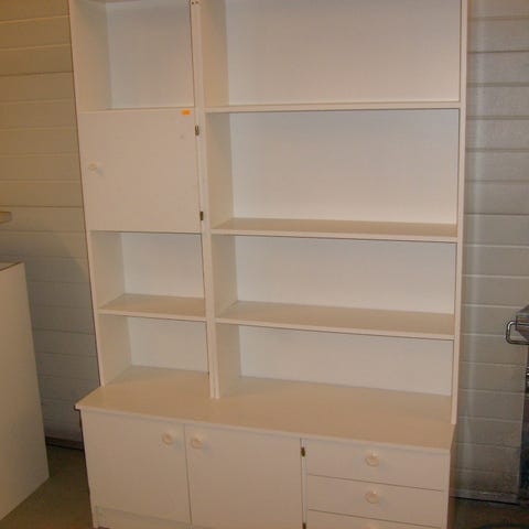 Puinen olohuoneen kirjahylly vitriinikaapilla, ruskea. Kirjahylly koostuu kolmesta moduulista, joissa on avohyllyjä, kaapistoja ja laatikoita säilytystä varten. Yhdessä osassa on lasiovellinen vitriinikaappi koriste-esineille tai astioille. Alatasoilla on ovellisia kaappeja ja keskiosassa laatikosto. Soveltuu esimerkiksi kirjojen, astioiden ja muiden esineiden säilytykseen ja esillepanoon olohuoneessa tai työhuoneessa. Moduulit saa erilleen toisistaan. Joko 15 /moduli tai kaikki kolme yhteensä 30 EUR.Sijainti 3 KRS,ei hissiä,joten ostajalla on hyvä olla kantajat mukana.
