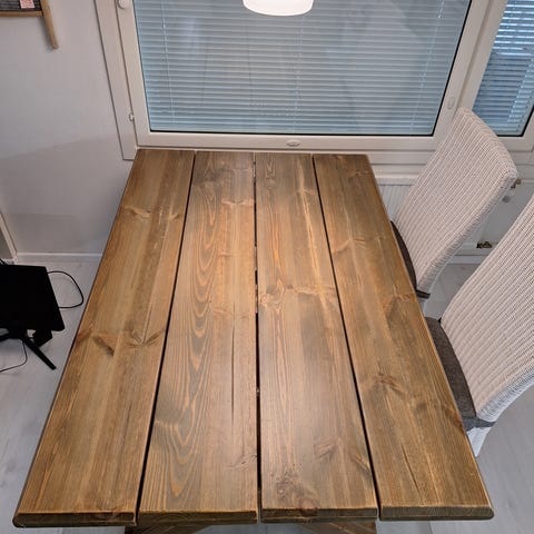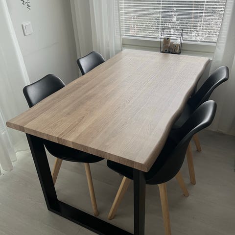 Lana lankkupöytä. Rustiikkinen ja jykevä ruokapöytä 150x86cm ja korkeus 76cm. Aaltomainen muotoilu ja eläväinen pinta, jossa puun syyt ja kuviointi näkyvät kauniisti. Pöytä on ehjä, pieniä jälkiä varmasti, mutta eläväisessä pinnassa ei häiritse. Vain nouto.