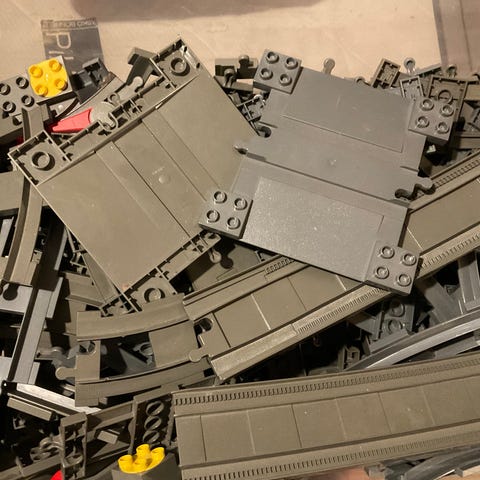 LEGO junarata 7720 rakennussarja 80-luvulta. Lähes kaikki palaset löytyvät tai korvattu toisenvärisillä. Sininen patterivaunu ei toimi ja toinen puomi puuttuu. Mukana alkuperäinen laatikko ja ohjeet.