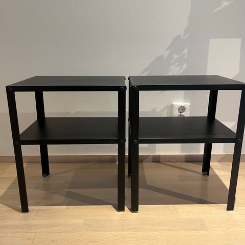 Näkyviltä pinnoiltaan siistit ja toimivat vetolaatikolliset yöpöydät. Kummassakin kyljessä 2"x2" palikat kiinni kahdella ruuvilla koska olivat suoraan sängynpäädyssä kiinni.