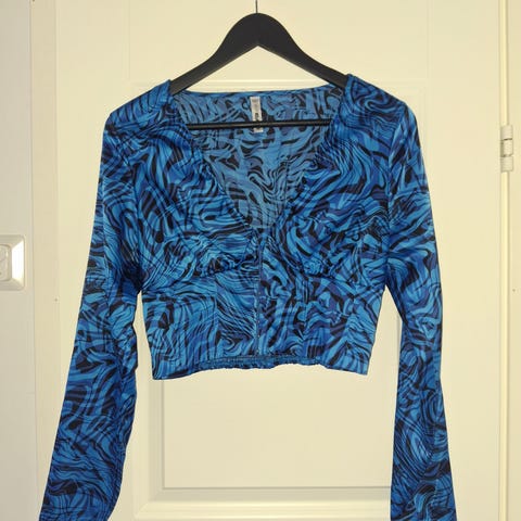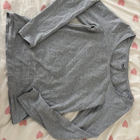 Pinkki pitkähihainen. Hihat levenevät ja paita on cropattu. Edessä pieni tahra ja takana alasauma purkautunut