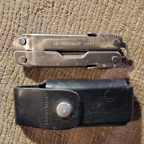 Uudenveroinen Leathermanin Wave+. Mukaan tulee työkalun mukana tullut kangastasku tukevalla napilla, minkä voi kiinnittää vaikka vyölle. Itsellä jäänyt käyttämättömäksi.