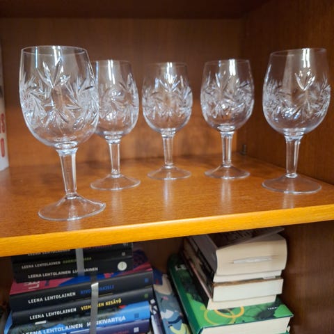 5 kpl valkoviinilaseja, korkeus 17 cm, halkaisija 7 cm, kaikki ehjiä.