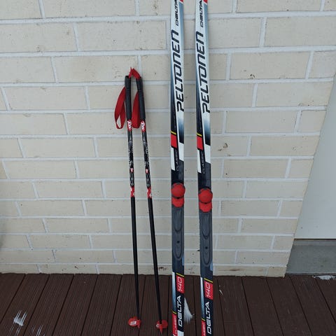 Peltonen sukset 140cm ja Alpina monot koko 35