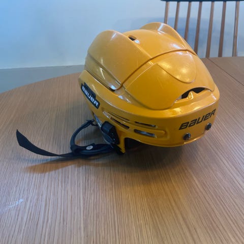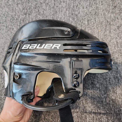 Bauer jääkiekkokypärä valkoisena, koko S, 53-57 cm. Kypärässä on säädettävä leukahihna ja pehmustettu sisäosa. Soveltuu jääkiekkoon ja muuhun jääurheiluun, jossa tarvitaan pään suojausta.